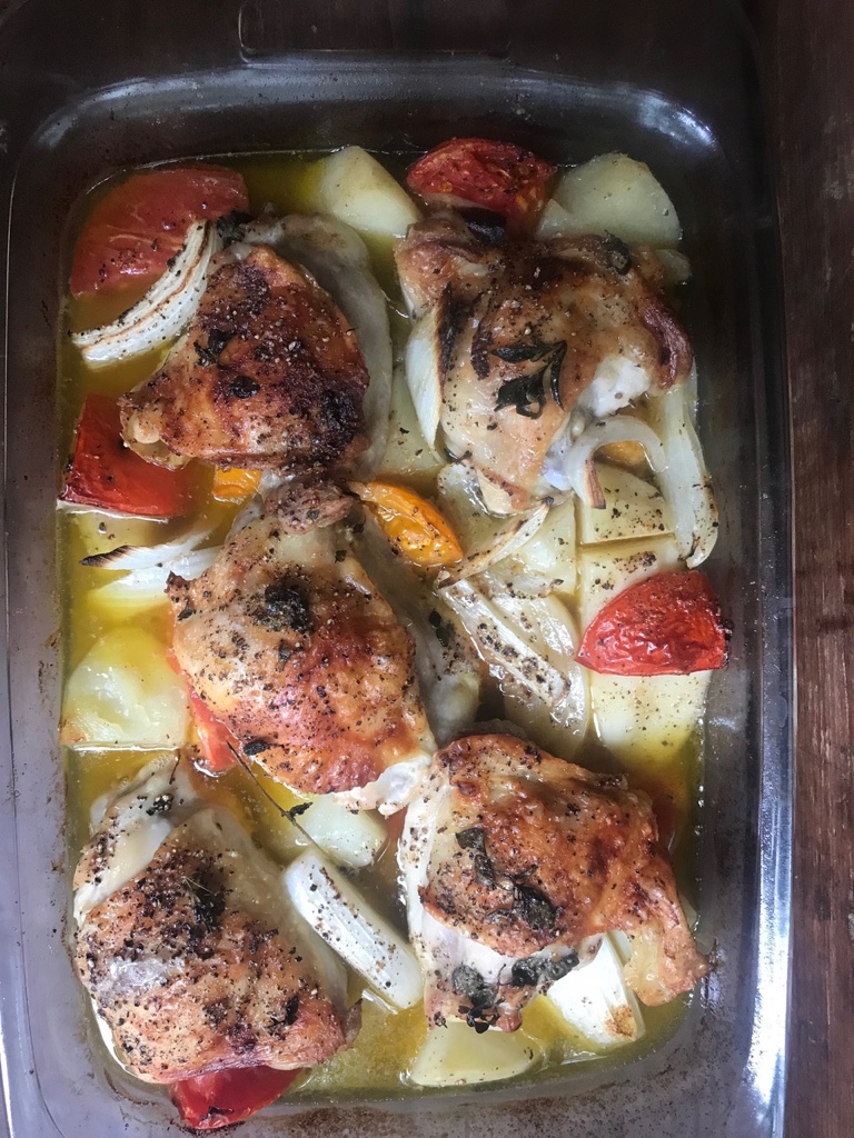 Right now I’m harvesting tomatoes, onions and potatoes. Seasonal veggies make this a satisfying and easy supper. Use other chicken pieces, too. Just know white meat cooks faster than dark.