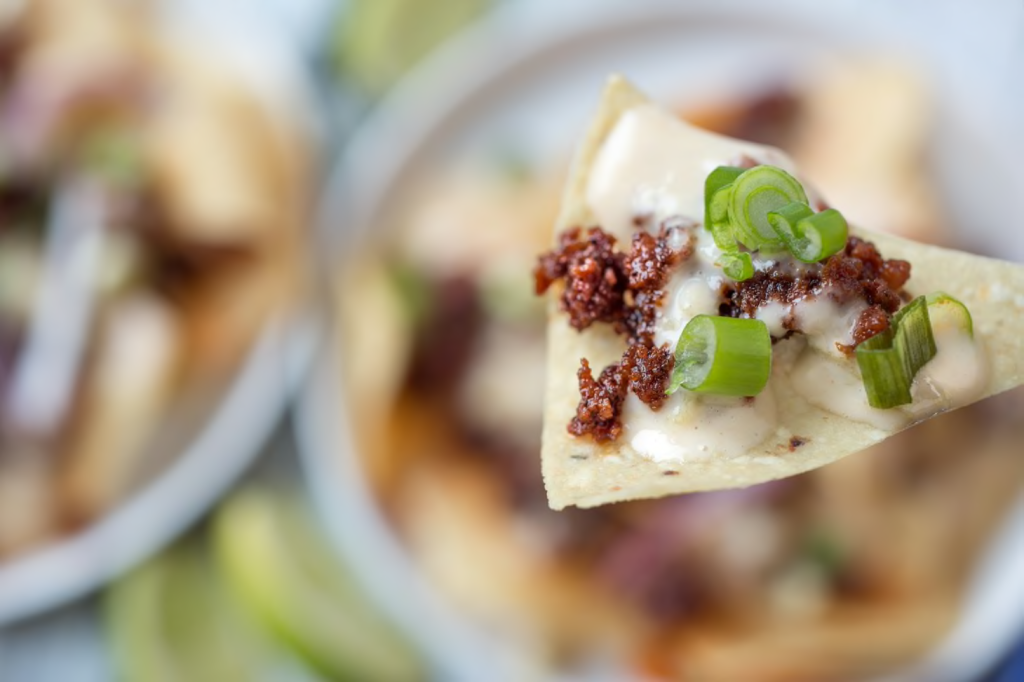 CHORIZO NACHOS WITH WHITE QUESO SAUCE