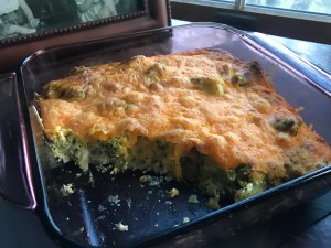 Put in casserole and bake 35 minutes or so until bubbly around the edges and broccoli is cooked through.