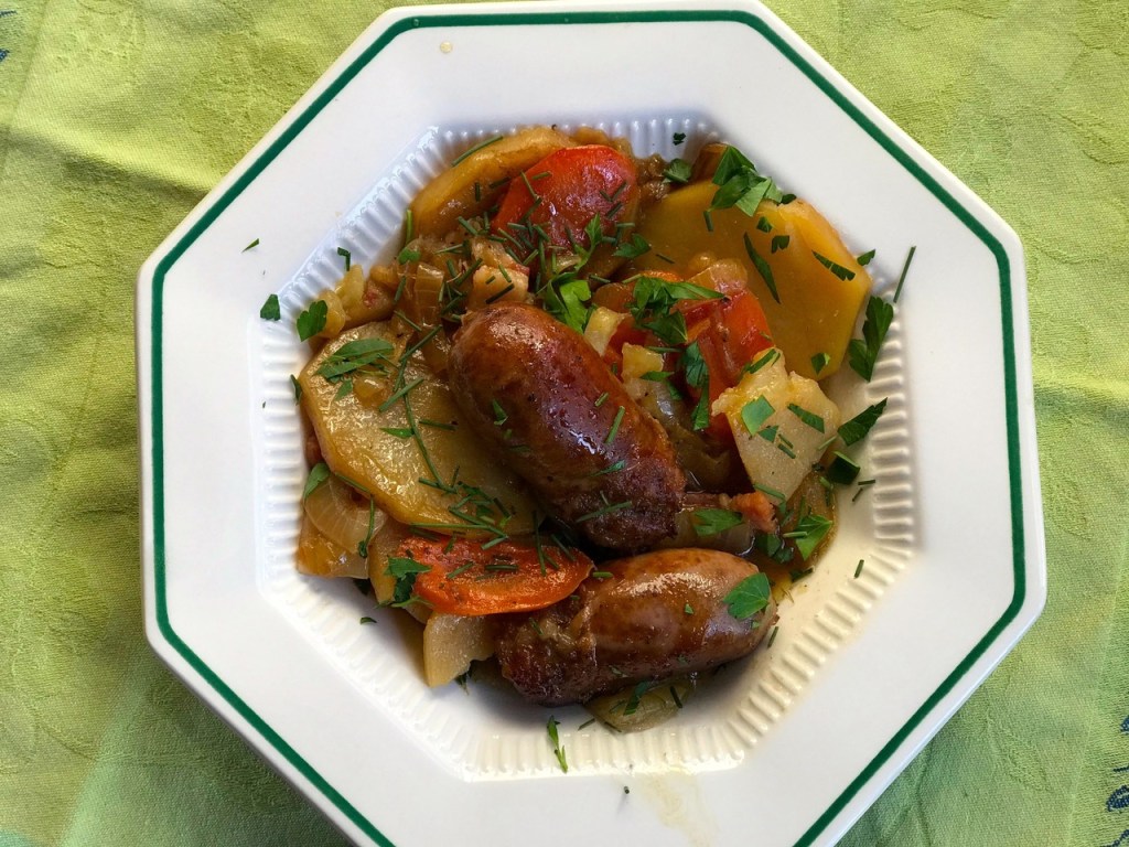 Raise heat a bit and cook until sausages start to brown. Careful not to burn onions.