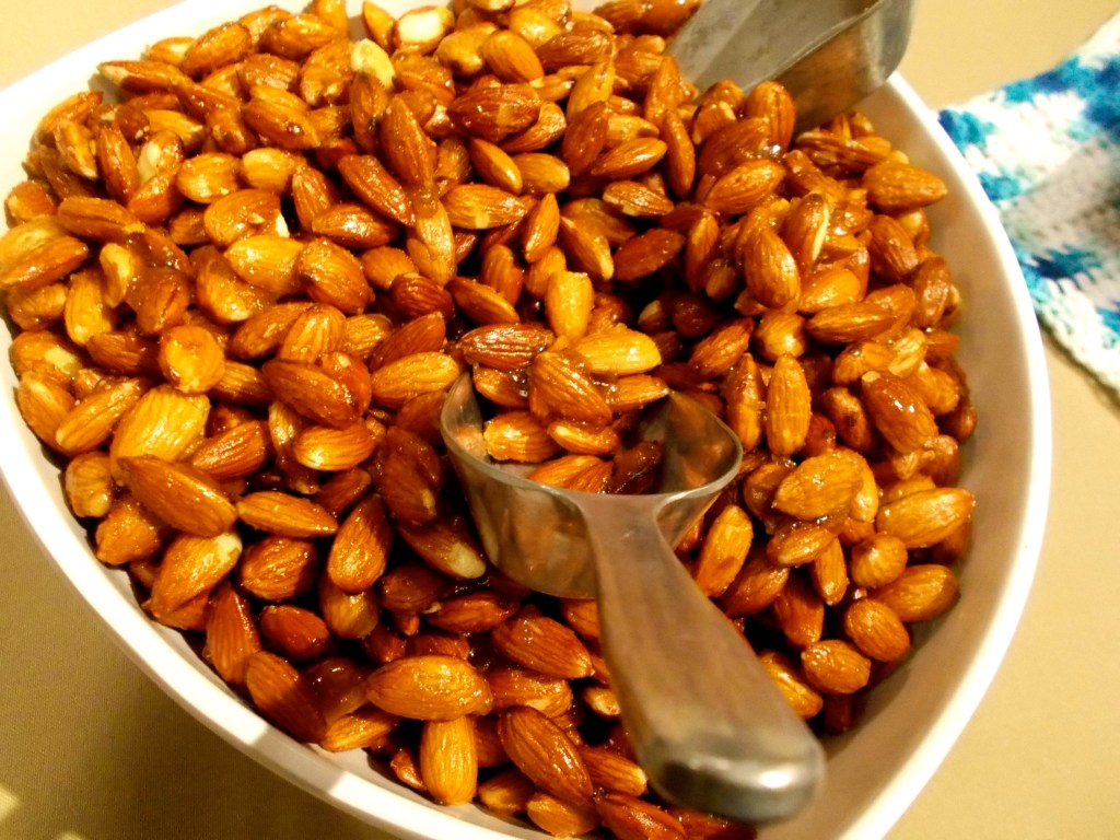 Well, our holiday sweet of choice is our Lebanese baklava. Also Jordan almonds – large almonds with a sweet candy coating. And always I have Halva – that sesame seed confection. Now there’s no real recipe for our baklava – a little of this and a little of that, but as far as the almonds go, here’s a recipe for honey roasted almonds – I think they are excellent and a good substitute for the Jordan almonds: