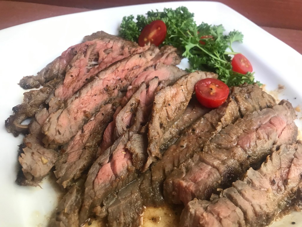 Grill the meat over high direct heat for 3-5 minutes per side. (the grill must be very hot or the meat will be tough and chewy!) Rest the meat for 10 minutes then slice it thinly (1/4 “ thick) against the grain.
