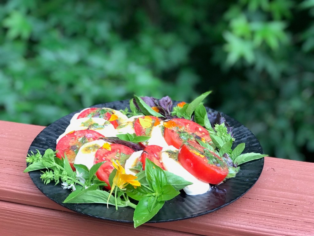 After feeding my little flock of chickens this morning, I walked over to the vegetable garden to see what needed picking. Well, just about everything. Cucumbers, squash, corn, and tomatoes. I was happiest about the tomatoes. What I thought would be an early harvest turned out not to be so. Some of my tomatoes, for some unknown reason, are taking their good time about ripening. The wait is worth it, though. I picked enough juicy red globe tomatoes for one of our most loved summer salads: Caprese.