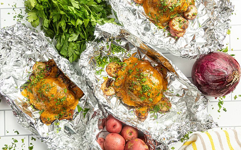 Each dinner requires 2 sheets of foil, 12”x18’’. Spray foil with nonstick spray.