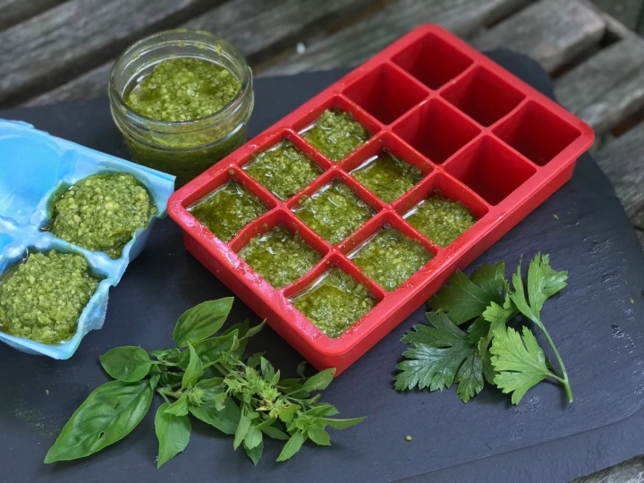 When pesto in the ice cube trays and egg cartons freezes hard, I pop the portions out and put them in freezer bags.