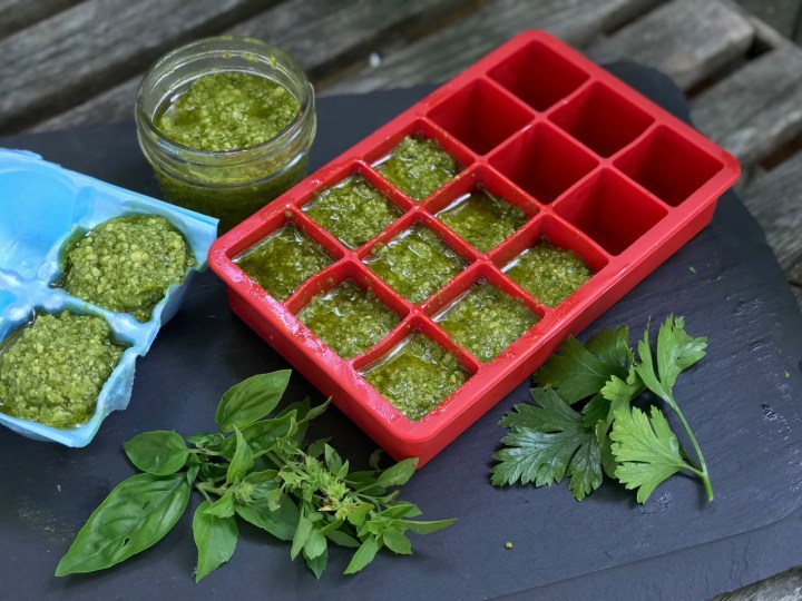 Instead of a thick layer of olive oil to coat pesto for freezing, I just brushed a bit on top of the finished pesto. That’s enough to keep air out and prevent pesto from turning dark. The bonus? Flavor isn’t altered with too much oil.