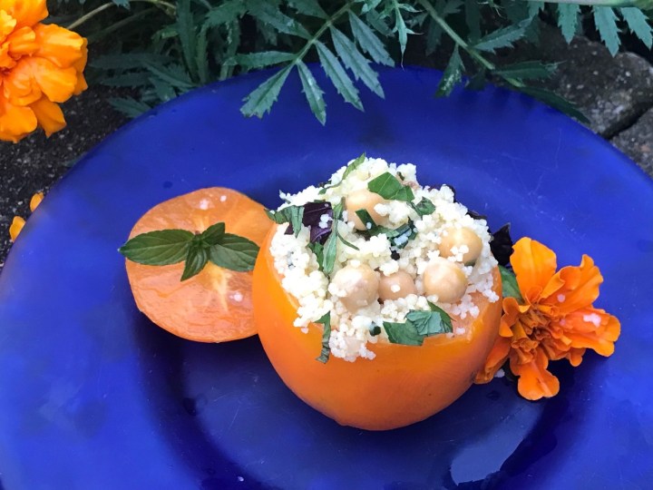 than their ruby colored cousins, yellow tomatoes lend a subtle flavor when stuffed. Take the recipe I’m sharing today. Couscous, summer herbs, chick peas and a bit of zucchini are piled into a thick golden shell. I was reminded of this classic when I read one of my favorite chef’s articles featuring a version of this – Christina Cooks.