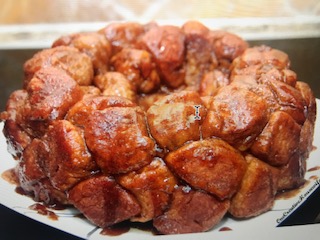 Cover pan with a large plate and invert it to release the monkey bread. To eat, pull the desired amount off with your fingers (like a monkey would!).