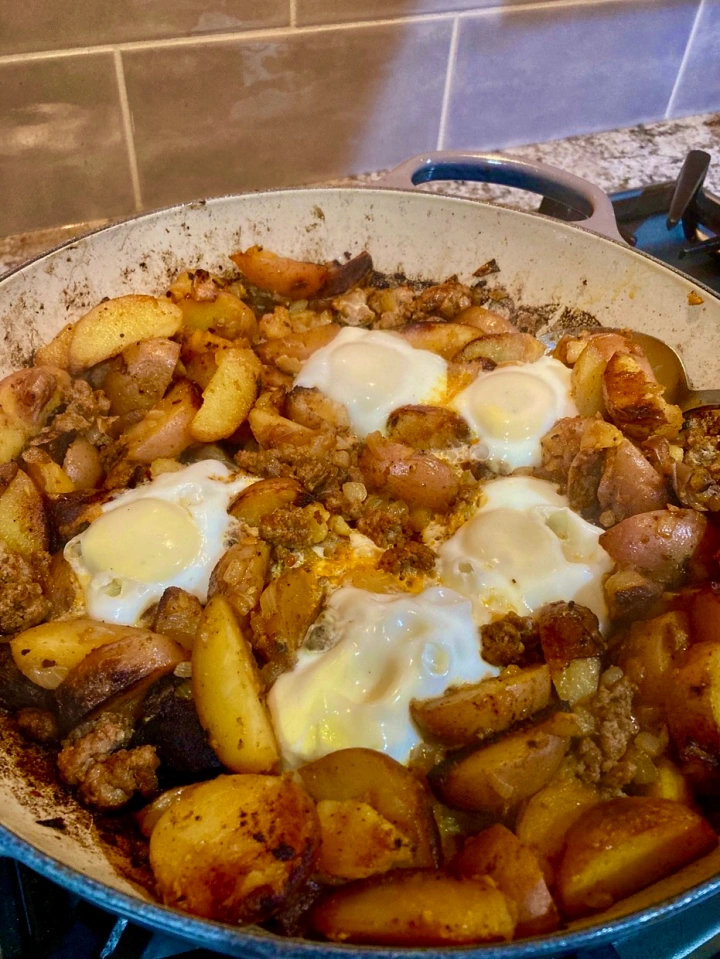 And since we just harvested some of our potatoes, I’ll put those and the eggs together with onion, garlic, chorizo sausage and smoked paprika to make a skillet supper for my husband, Frank and myself.
