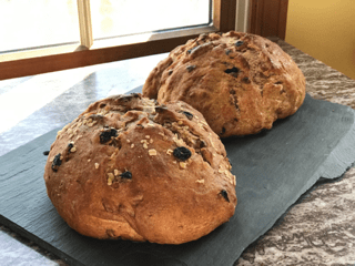 Adapted from a medjugorje.orgrecipe from Sr. Emmanuels’ book “Healing through Fasting”. Really hearty and sustaining. This bread is dense with a thick crust. The flavor is fairly “wheaty” with a touch of sweetness from the honey and fruit.