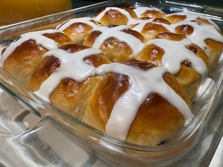 As we get ready for Easter week, the last week in Lent, I chatted with Matt Swaim this morning and the subject was hot cross buns, which we make every Lent for Good Friday. I’ve shared recipes in the past for this special treat. Here’s the latest – this time I added a bit of baking powder for extra “oomph”.