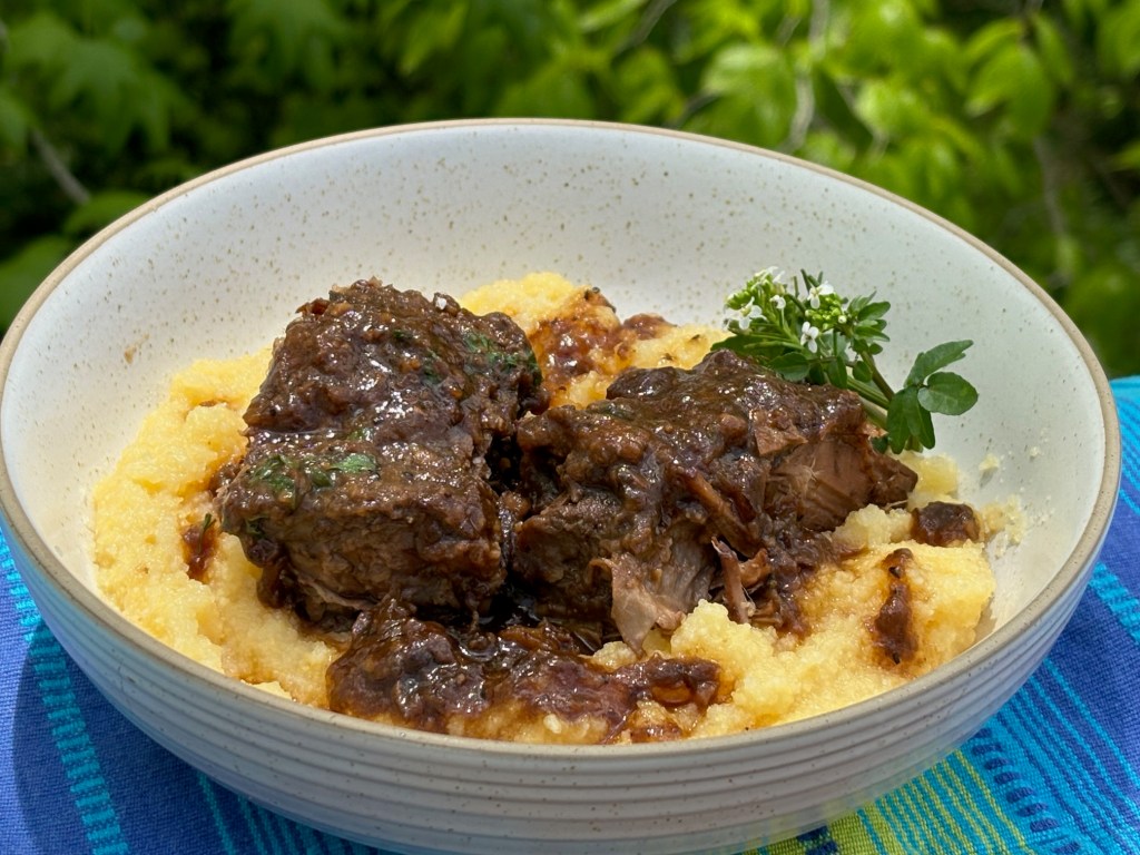 OK so let’s talk about stracotto. An Italian version of pot roast, stracotto means overcooked, and that description fits. Chuck roast is slowly oven braised with onions, garlic, porcini mushrooms, thyme and rosemary. Red wine and beef broth make the liquid component. It’s a savory, delicious meal.