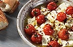 Put feta in small casserole, sprinkle with garlic and oregano, then drizzle with oil and add a bit of pepper flakes, then top with tomatoes. Bake until cheese is soft and oil bubbles, about 20-25 minutes. Watch closely toward the end. Remove and let cool a bit before serving with crostini or pita chips.