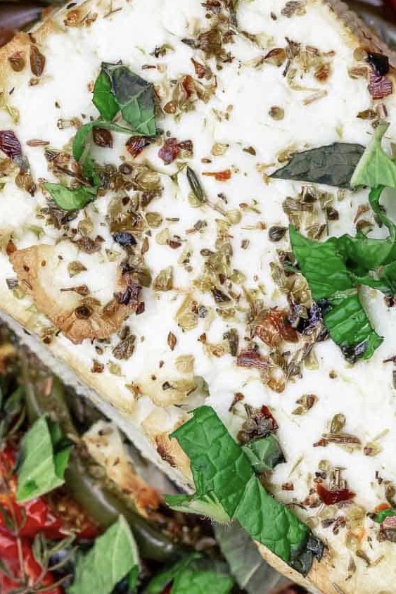 - Add the feta on top of the arranged veggies. Season the feta block with the remaining dried oregano, pinch of red pepper flakes and whatever remains of the fresh thyme. Drizzle a generous amount of extra virgin olive oil on the feta and make sure to brush the sides with some of the oil.
